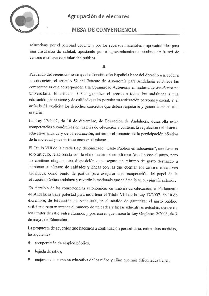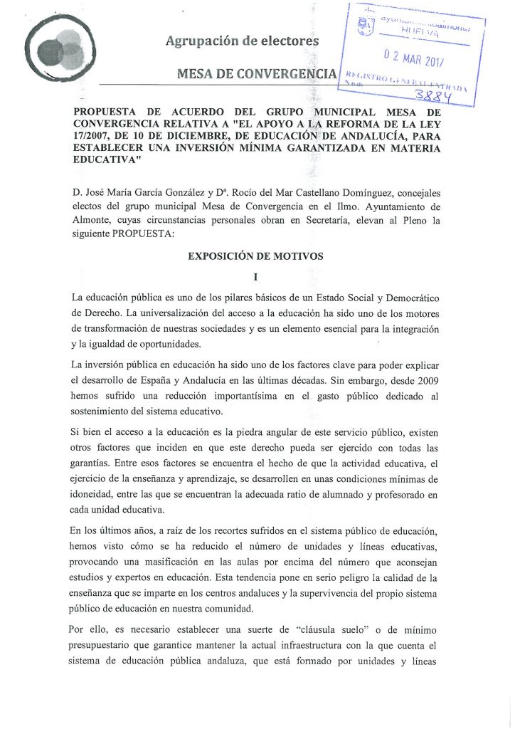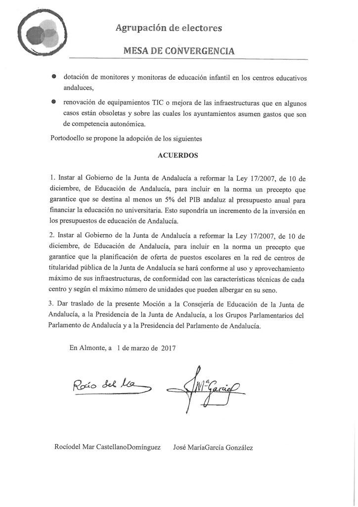 En el pleno de mayo 2017 propusimos instar al Gobierno y a la Junta de Andalucía fijar un mínimo del 5% del Producto Interior Bruto andaluz para el presupuesto en educación no universitaria. Debemos recuperar los niveles de inversión pública en educación para que vuelva a ser uno de los factores claves del desarrollo de España.