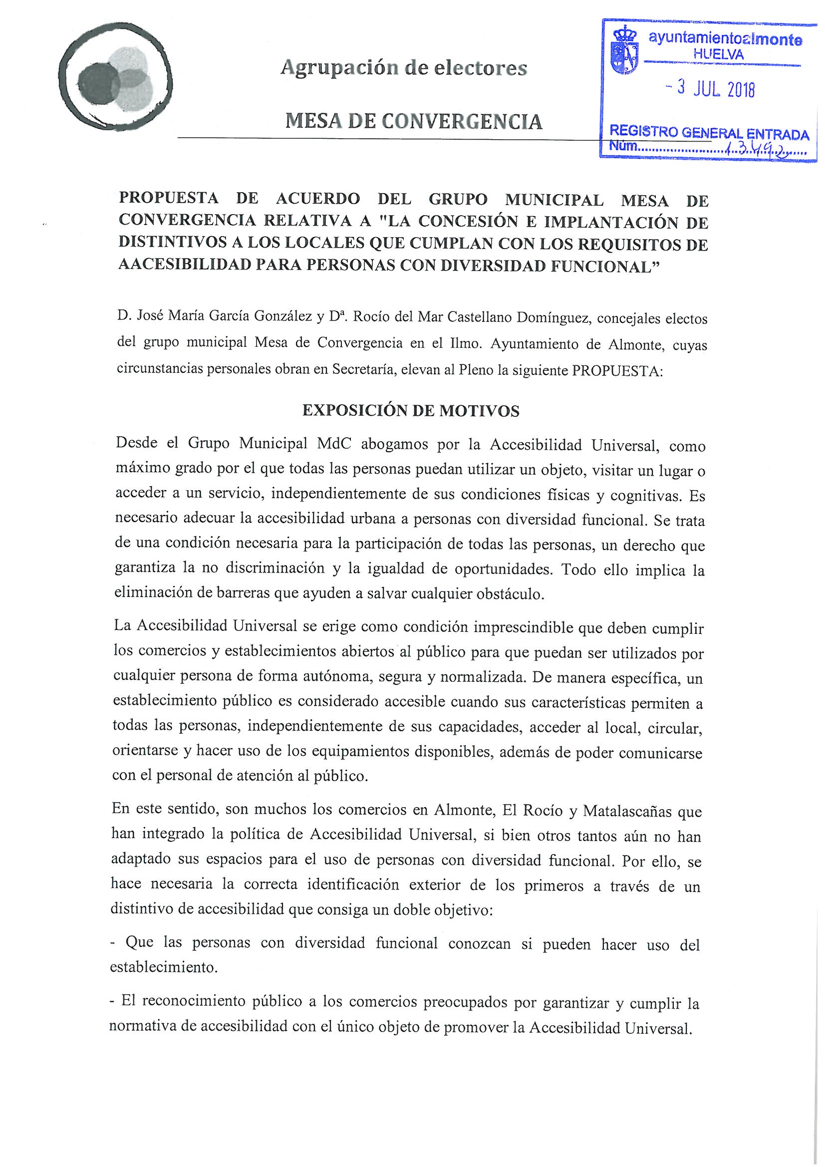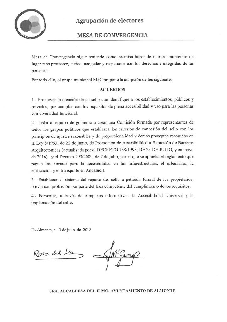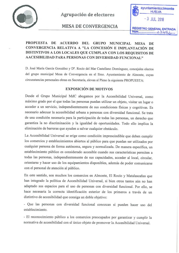 En el pleno de julio 2018 propusimos la creación de un sello de accesibilidad para los establecimientos, públicos y privados, que cumplan con los requisitos que previamente se establezcan, así como fomentar, a través de campañas informativas, la accesibilidad universal y la implantación del sello.
