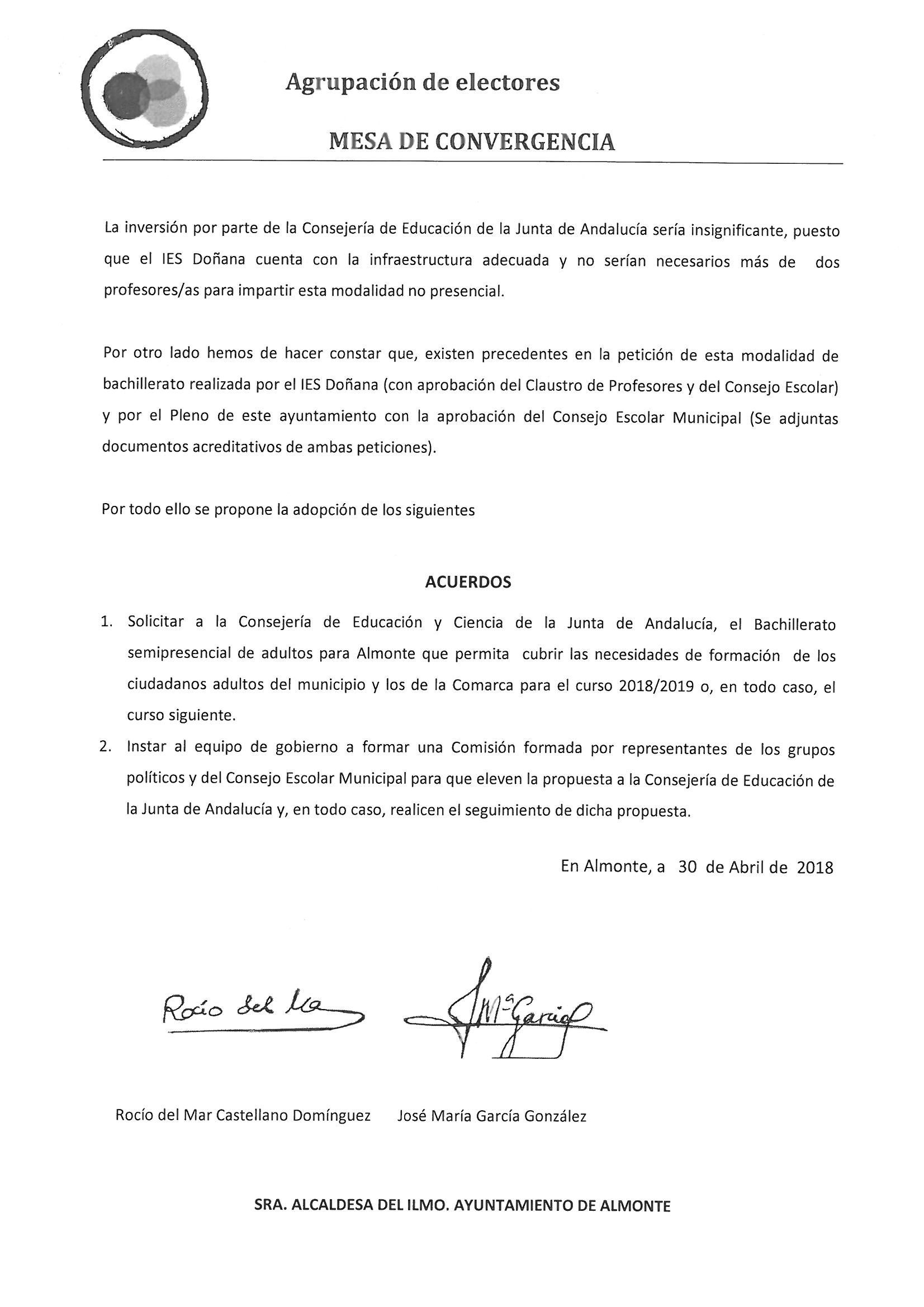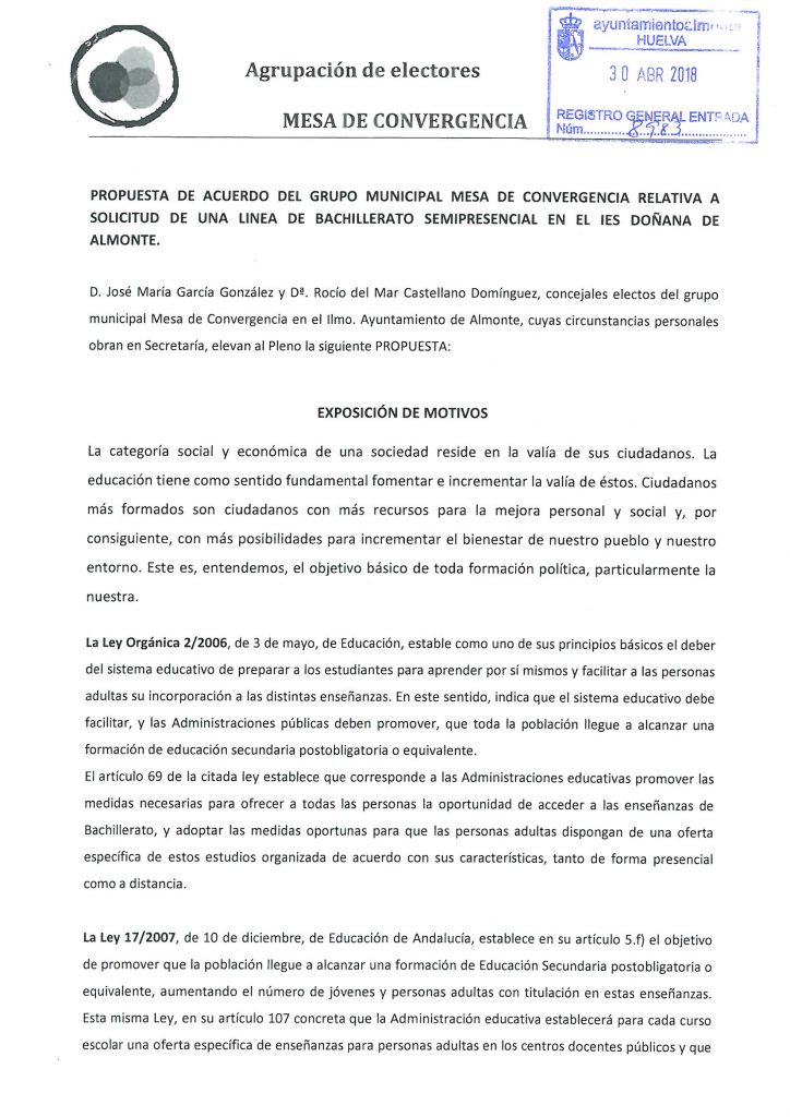 En el pleno de mayo 2018 propusimos solicitar a la Consejería de Educación de la Junta de Andalucía el bachillerato semipresencial de adultos para Almonte, que permita cubrir las necesidades de formación de la ciudadanía para el curso 2018/2019 y siguientes.