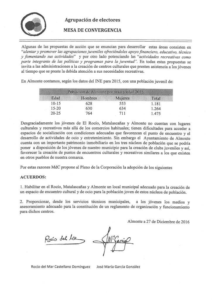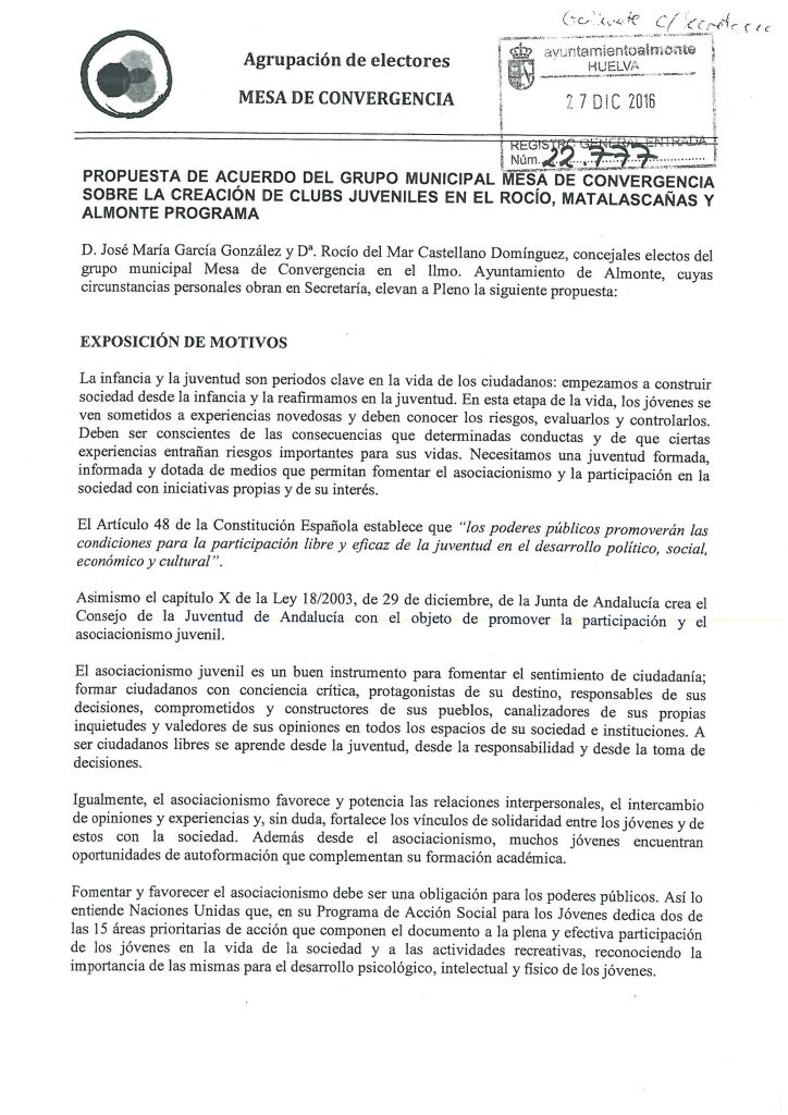 En el pleno de enero 2017 propusimos la creación de clubes juveniles en los tres núcleos, Almonte, El Rocío y Matalascañas, con la idea de promover las agrupaciones de nuestros jóvenes, ofreciéndoles apoyo financiero, educativo, técnico y fomentando sus actividades.