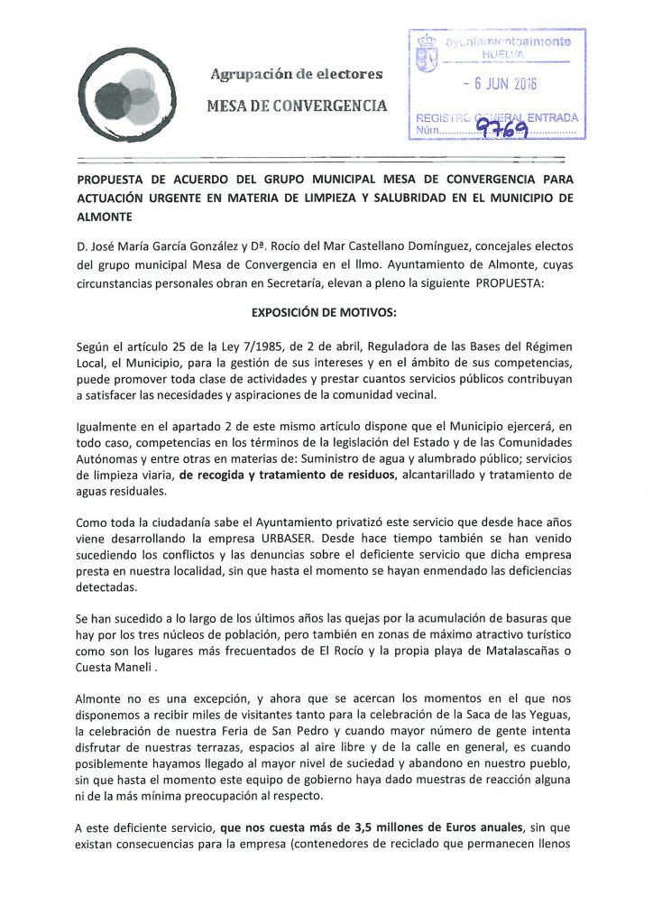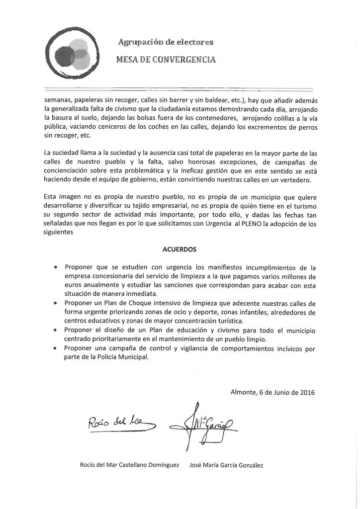 En el pleno de julio de 2016 propusimos un plan de choque intensivo para limpiar y adecentar las calles de nuestro municipio URGENTEMENTE, además de diseñar un plan de educación y civismo con la idea de mantener un municipio limpio y una campaña de control y vigilancia policial para sancionar conductas incívicas.
